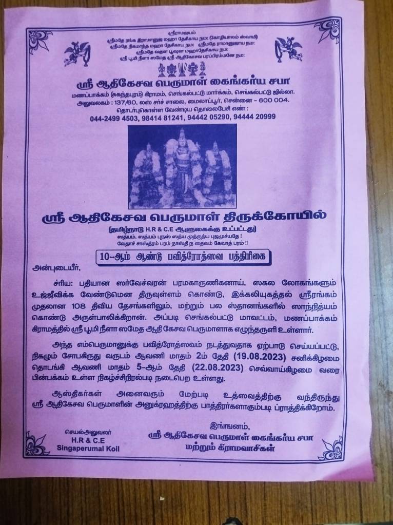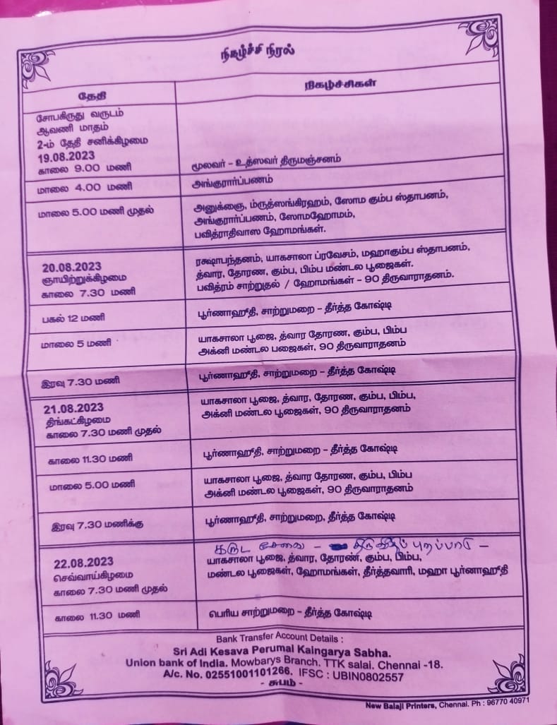 Your generous contributions/donations are requested to be forwarded to the following address “SRI AUDHIKESAVA PERUMAL KAINKARYA SABHA”, 137/60, Luz Church Road, Mylapore, Chennai – 600 004.